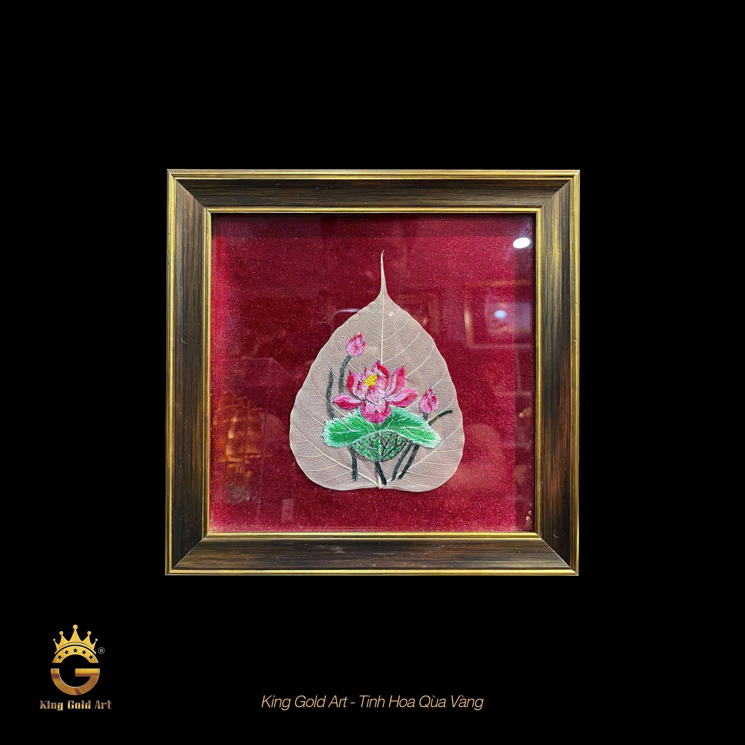 Tại King Gold Art, mỗi tác phẩm đều được tạo nên từ quy trình tỉ mỉ, nơi từng chiếc lá bồ đề được chọn lọc kỹ càng, xử lý công phu để giữ lại hệ gân tự nhiên hoàn mỹ. Sau đó, các nghệ nhân lâu năm thực hiện thêu tay hoa sen lên nền lá, tạo nên sự hòa quyện độc đáo giữa chất liệu tự nhiên và nghệ thuật truyền thống. Đây chính là giá trị cốt lõi làm nên sự khác biệt của tranh lá bồ đề thêu hoa sen so với các dòng tranh trang trí thông thường.