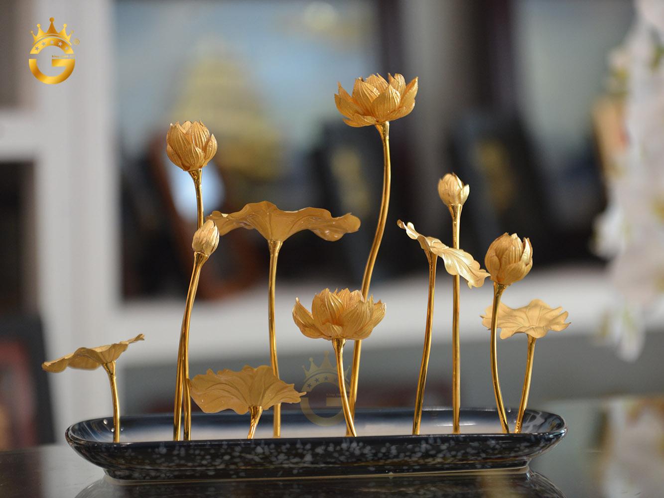 Chậu hoa sen mạ vàng bài trí phòng khách sang trọng