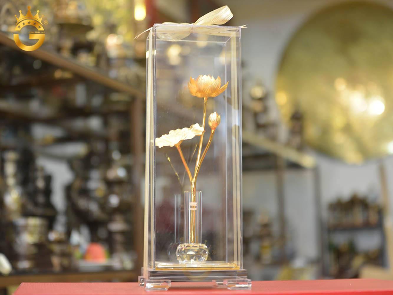 Hình tượng bông sen vàng 24k được tạo hình trang nhã và thanh lịch, mang thông điệp chứa đựng nhiều may mắn, bình an đến cho chủ nhân.