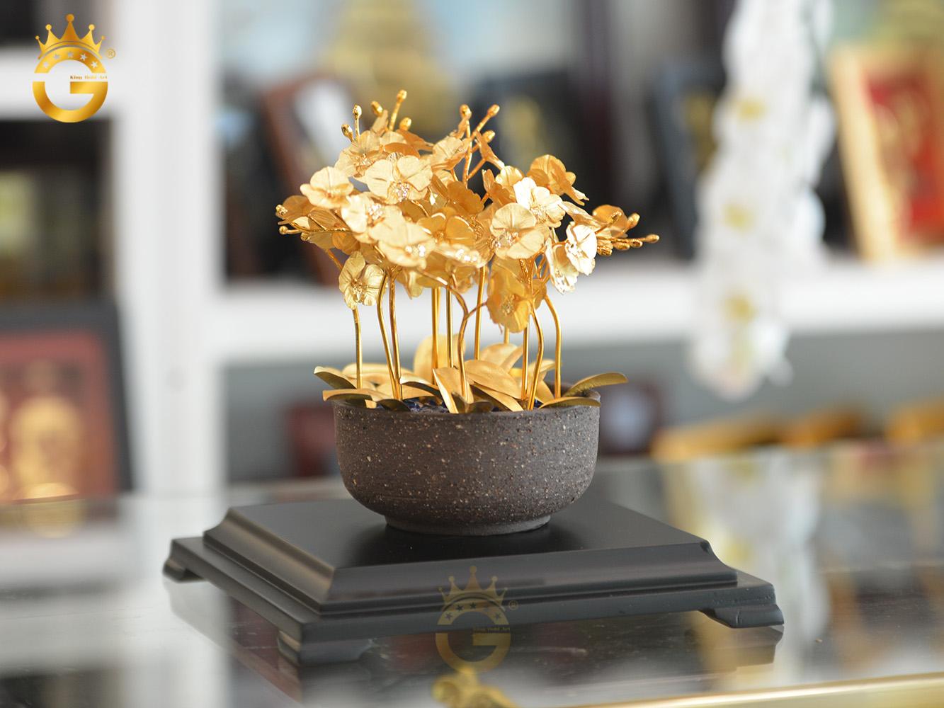 Ngoài ra, những chiếc lá cũng cho thấy nhựa sống dồi dào. Chúng có hình bầu dục, khá dài và tỏa ra theo nhiều hướng. Không những thế, món quà tặng mạ vàng này sở hữu ánh kim ngời sáng cực kỳ bắt mắt. Chậu hoa được đặt trên đế gỗ tam cấp màu giả cổ, càng tôn lên vẻ sang trọng, cao cấp cho sản phẩm.
